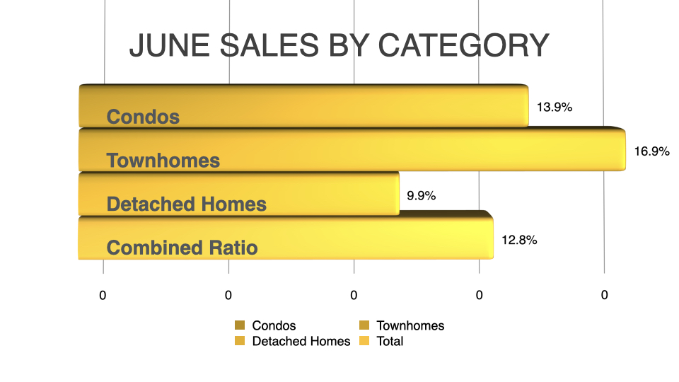 Across all detached, attached and apartment property types, the sales-to-active listings ratio for June 2025 is 12.8 per cent. By property type, the ratio is 9.9 per cent for detached homes, 16.9 per cent for attached, and 13.9 per cent for apartments.