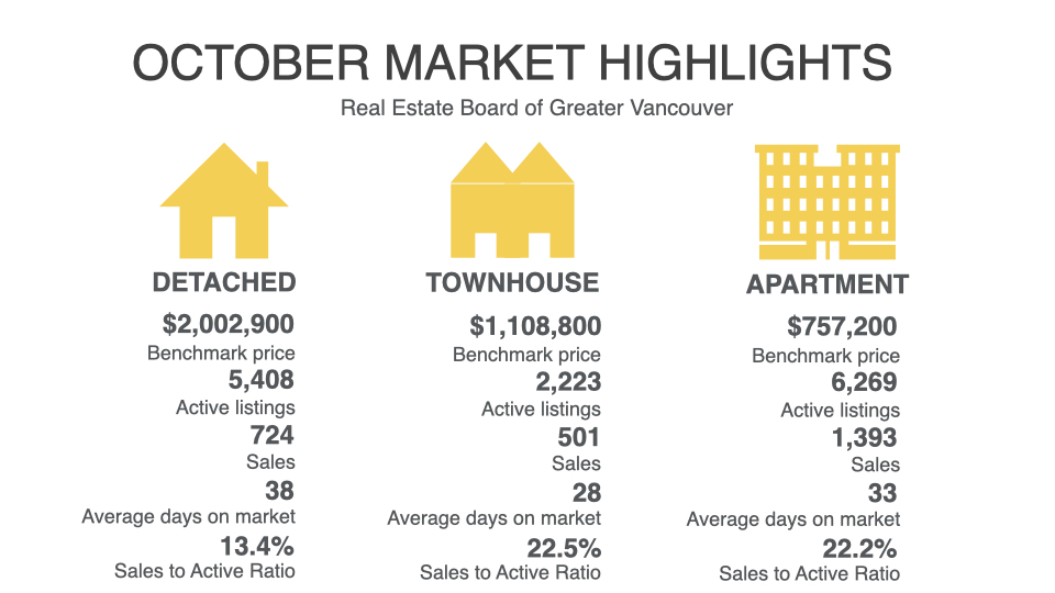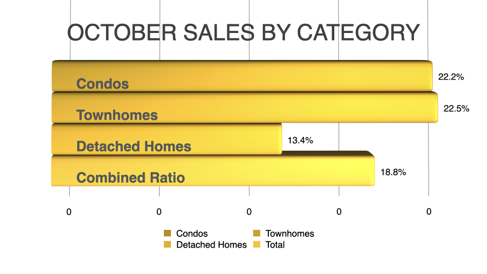 Across all detached, attached and apartment property types, the sales-to-active listings ratio for October 2024 is 18.8 per cent. By property type, the ratio is 13.4 per cent for detached homes, 22.5 per cent for attached, and 22.2 per cent for apartments.