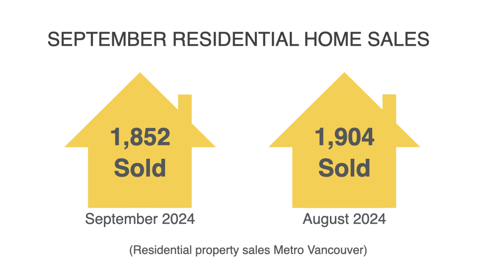Greater Vancouver REALTORS® (GVR)2 reports that residential sales in the region totalled 1,852 in September 2024, a 3.8 per cent decrease from the 1,926 sales recorded in September 2023. This was 26 per cent below the 10-year seasonal average (2,502).